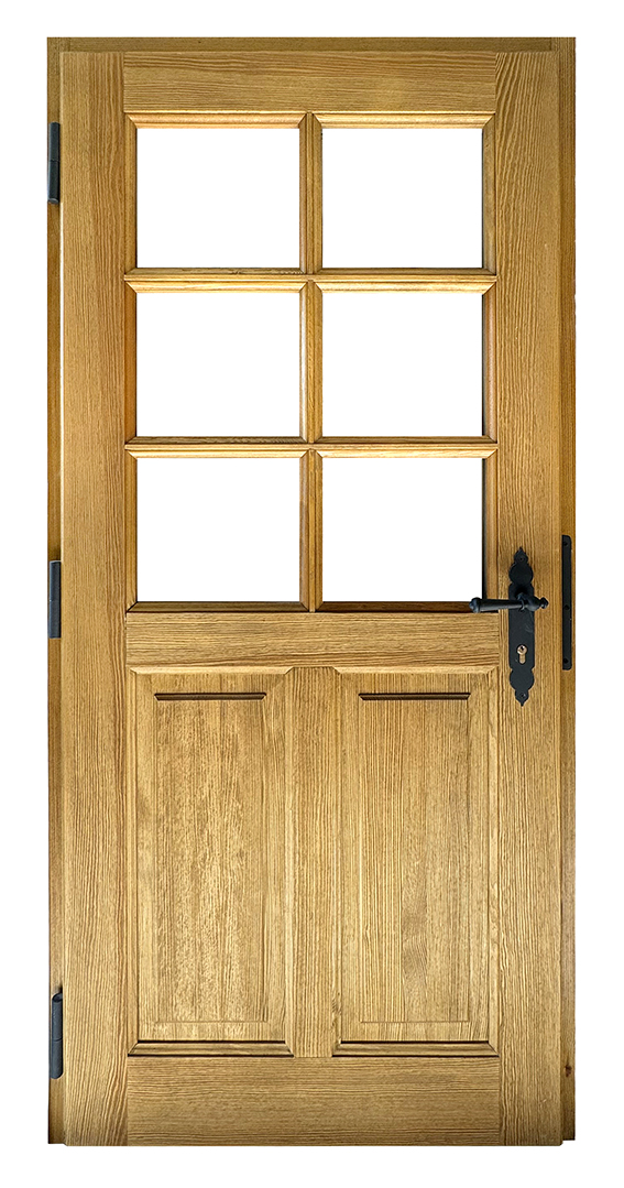 Massivholzeingangstüre, Kiefer massiv, inkl. Türstock bis 10cm, Innenisolierung, Doppelfalz, umlaufende Dichtung, Anschlagschiene, geschmiedete Bänder und Drückergarnitur, Oberfläche imprägniert und lasiert.